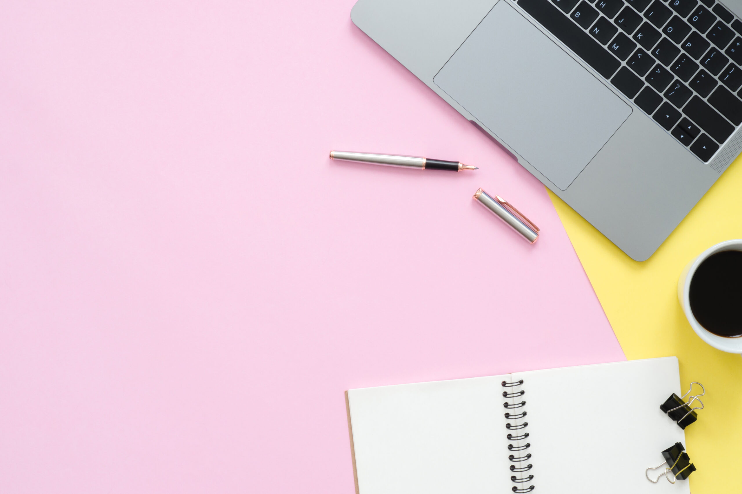 Creative flat lay photo of workspace desk. Top view office desk with laptop, blank empty notebooks and coffee cup on pastel color background. Top view with copy space, flat lay photography. | 前田出オフィシャルサイト